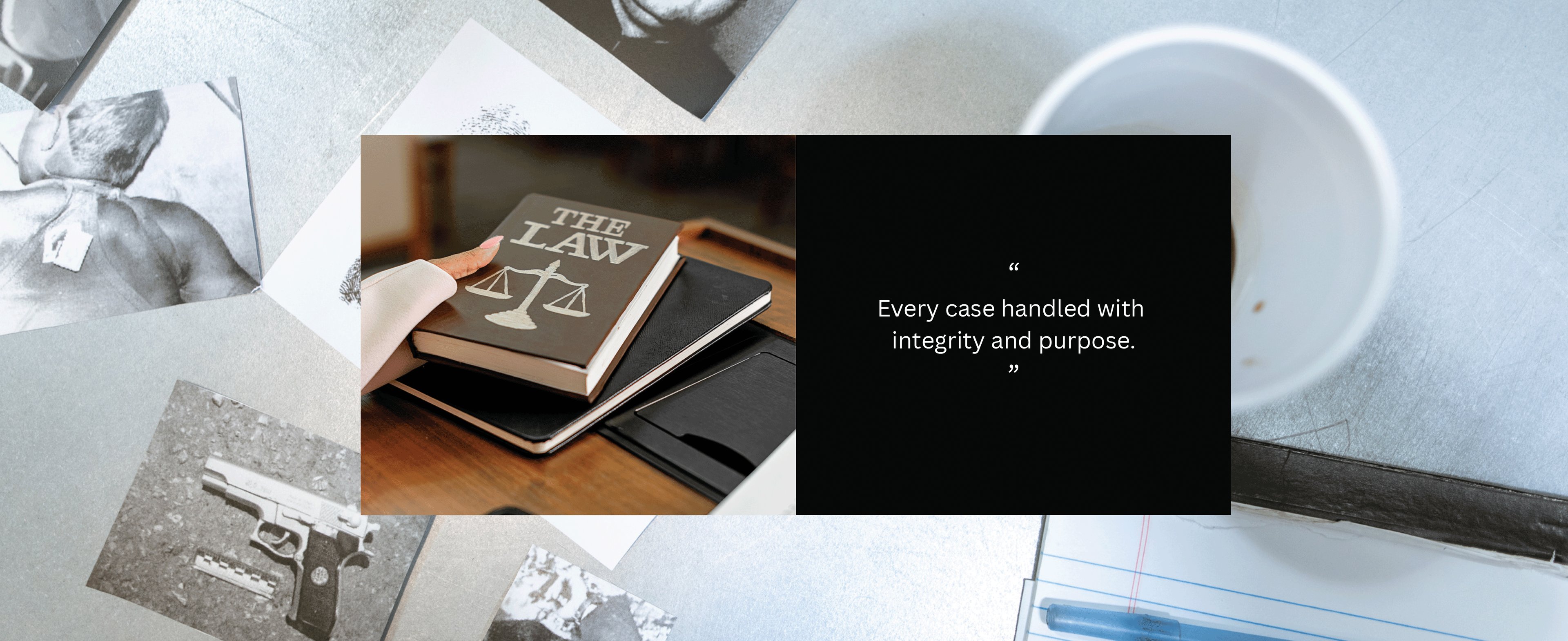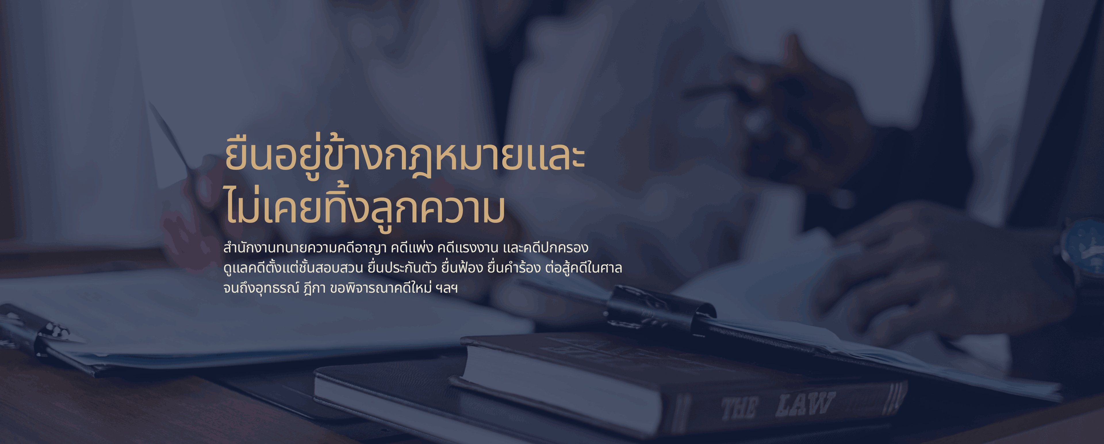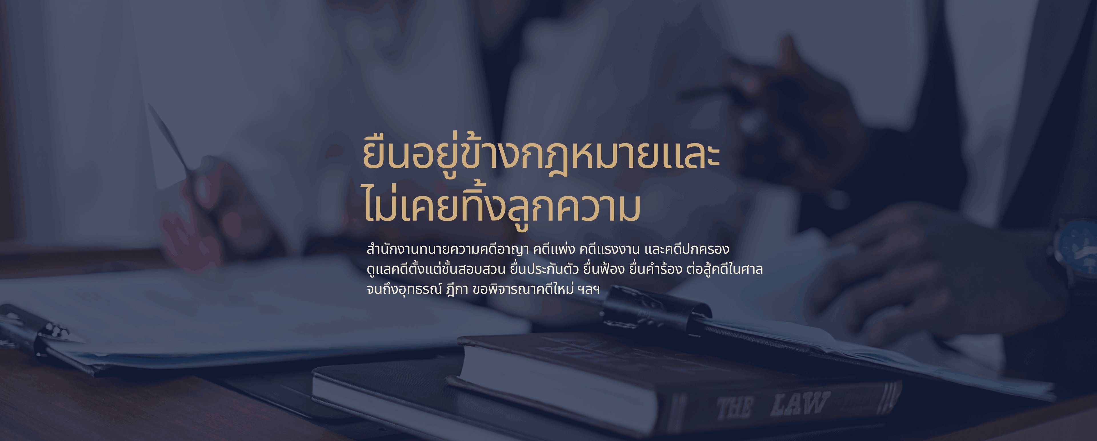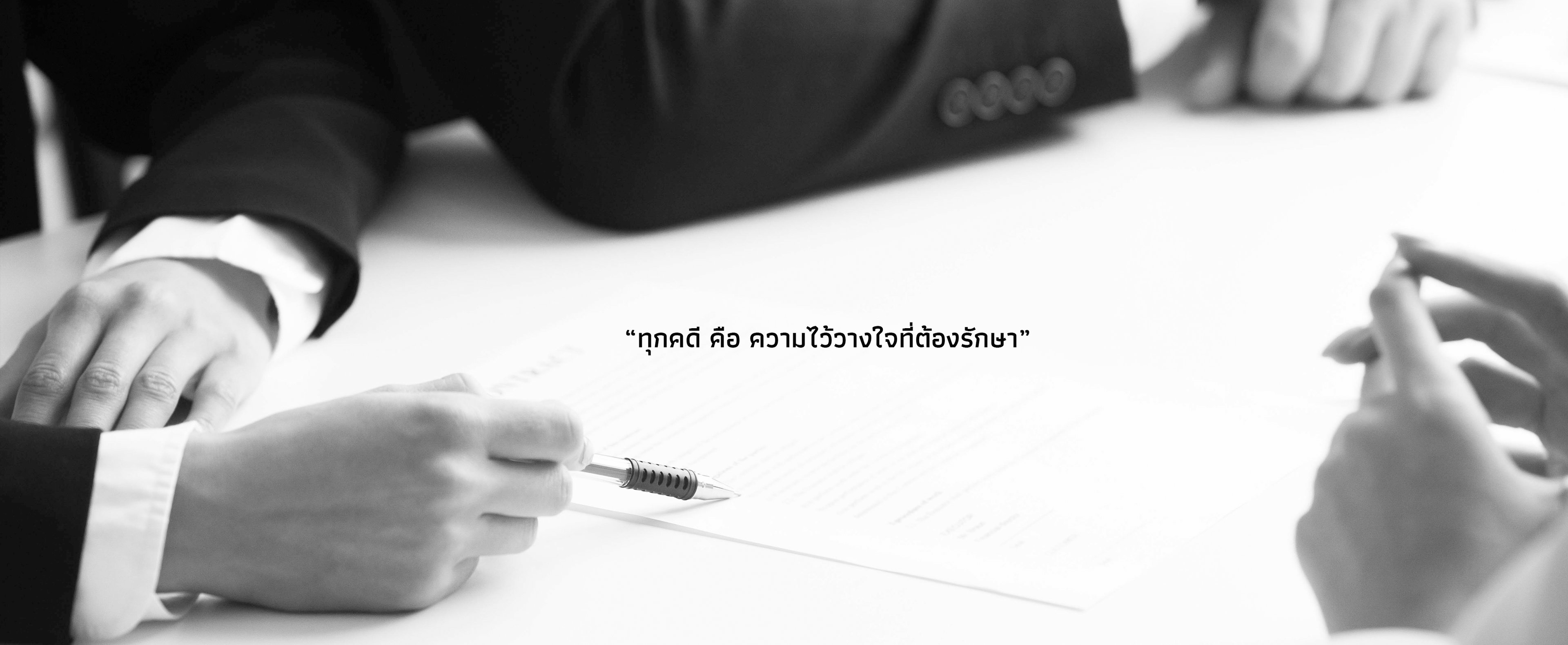 "เรายินดีรับฟ้งเรื่องราวของท่านด้วยความใส่ใจ ด้วยความมุ่งมั่นตั้งใจทำงานเพื่อแก้ปัญหาให้ลูกความ โดยใช้กฎหมาย ความรู้ ประสบการณ์ และความเชี่ยวชาญเกี่ยวกับคดีในการคิดวิเคราะห์ข้อเท็จจริงประกอบพยานหลักฐาน"